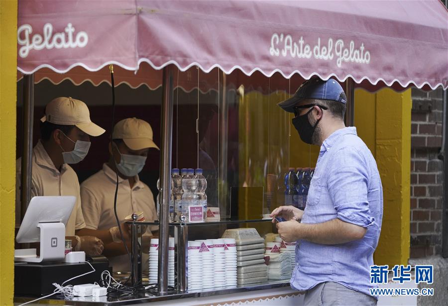 9月7日,顾客在美国纽约的切尔西市场户外餐区购买冷饮。 位于纽约曼哈顿下城的切尔西市场是纽约著名的餐饮和购物地。受新冠疫情影响,目前该市场只有部分餐饮和零售店铺恢复了营业,客流量也明显下降。 新华社记者 王迎 摄