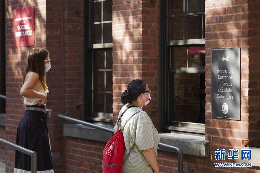 9月7日,行人从美国纽约切尔西市场外的引导标识旁走过。 位于纽约曼哈顿下城的切尔西市场是纽约著名的餐饮和购物地。受新冠疫情影响,目前该市场只有部分餐饮和零售店铺恢复了营业,客流量也明显下降。 新华社记者 王迎 摄