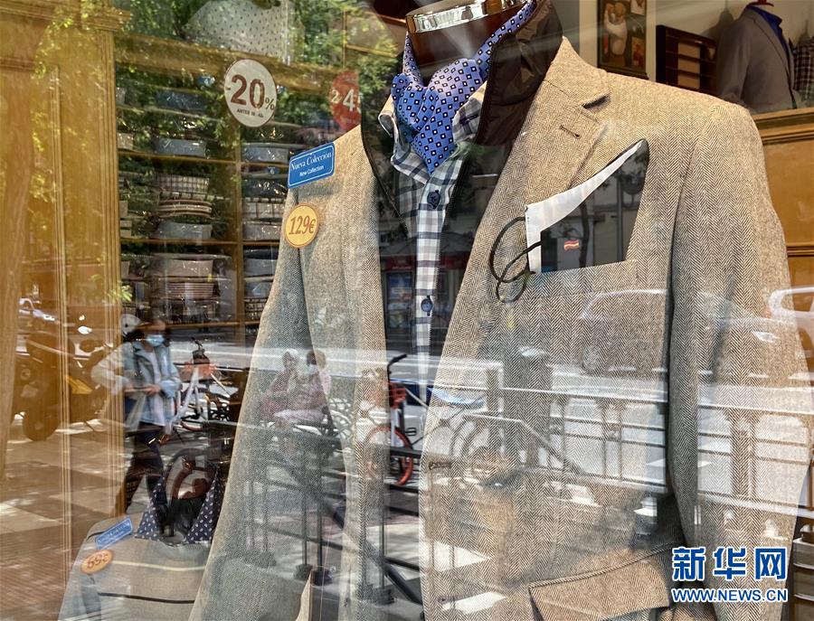 这是9月7日在西班牙马德里拍摄的一家商店橱窗内用口罩作为配饰的服装。 根据西班牙卫生部9月7日更新的数据显示,该国累计新冠确诊病例525549例。 新华社记者 孟鼎博 摄