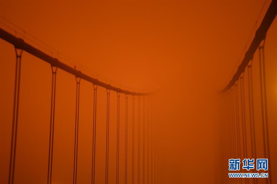 这是9月9日中午拍摄的美国加利福尼亚州旧金山金门大桥。 美国加利福尼亚州北部山火连日燃烧,形成的烟尘遮天蔽日。受其影响,9日正午时分,旧金山仍如夜晚般昏暗。 新华社记者 吴晓凌 摄