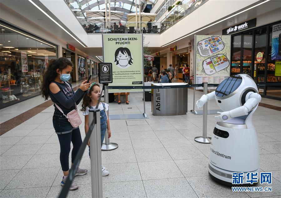 9月12日,在德国法兰克福的一家商场内,孩子们观看一台智能机器人讲解防范新冠肺炎疫情的相关知识。 近日,德国法兰克福市的一家商场在固定区域内启用一台智能机器人,向过往市民讲解防范新冠肺炎疫情的相关知识,提醒人们安全防疫。 新华社记者 逯阳 摄