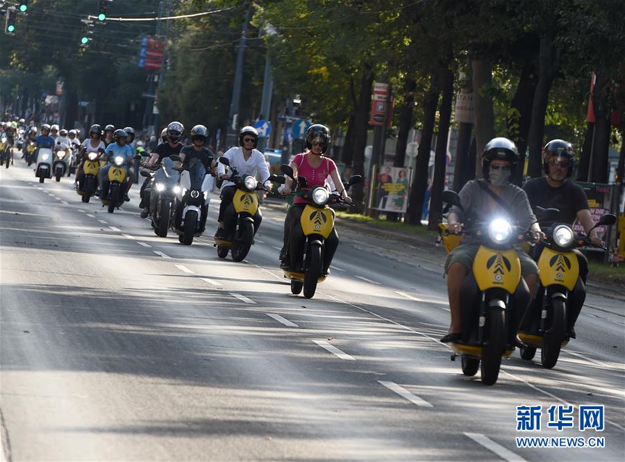 这是9月13日在奥地利维也纳拍摄的电动出行大巡游活动中的电动摩托车。 当日,奥地利首都维也纳在该市著名的内城区环城大道上举行电动出行大巡游活动,共有几百辆电动汽车、电动摩托车以及各类电动交通工具参加。据介绍,本次活动旨在呼吁和促进无排放、高效以及安静的出行方式。 新华社记者 郭晨 摄