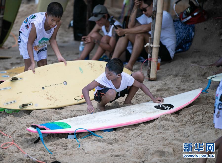 9月13日,在泰国普吉卡利姆海滩,参加2020普吉冲浪比赛的小选手做赛前准备。 9月13至15日,2020普吉冲浪大赛在泰国普吉卡利姆海滩举行。 新华社记者 张可任 摄