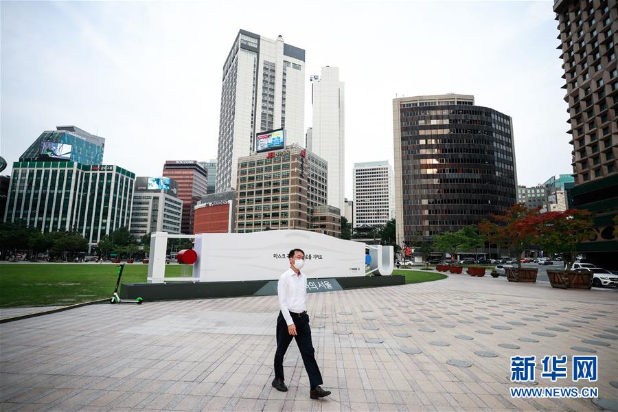 9月15日,一名戴口罩的行人从韩国首尔市政府广场前走过。 韩国政府13日宣布暂时解除针对首都圈的加强版防疫措施,但将继续维持该地区的防疫级别为保持社交距离第二阶段。 新华社记者 王婧嫱 摄