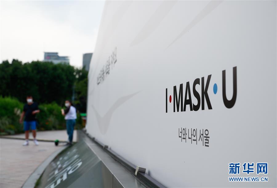 这是9月15日拍摄的韩国首尔市政府广场前的标志,首尔市宣传语最近由“I·SEOUL·U”变成了“I·MASK·U”。 韩国政府13日宣布暂时解除针对首都圈的加强版防疫措施,但将继续维持该地区的防疫级别为保持社交距离第二阶段。 新华社记者 王婧嫱 摄