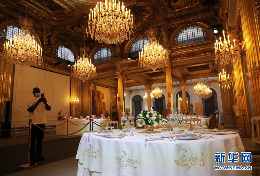 这是9月19日在法国总统府爱丽舍宫的节日大厅拍摄的国宴餐桌和餐具。 为期两天的欧洲遗产日于19日拉开帷幕。受新冠肺炎疫情反弹影响,法国部分疫情严重地区宣布取消今年的遗产日活动。如期召开的遗产日活动中也对观众人数进行了严格限制,活动要求参观者提前在网上预约,参观过程中必须佩戴口罩,保持安全距离等。法国总统府爱丽舍宫今年将参观人数限制在每天2500人,为以往参观人数的三分之一。欧洲遗产日活动源于法国。最初这项活动定于每年9月的第三个周日举办,1992年改为周六和周日两天举行。如今,遗产日活动已经扩展到欧洲各国,成为整个欧洲的一项重要文化活动。 新华社记者 高静 摄