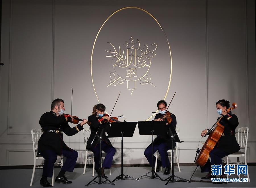 9月19日,在法国总统府爱丽舍宫的节日大厅,乐队为参观者演奏。 为期两天的欧洲遗产日于19日拉开帷幕。受新冠肺炎疫情反弹影响,法国部分疫情严重地区宣布取消今年的遗产日活动。如期召开的遗产日活动中也对观众人数进行了严格限制,活动要求参观者提前在网上预约,参观过程中必须佩戴口罩,保持安全距离等。法国总统府爱丽舍宫今年将参观人数限制在每天2500人,为以往参观人数的三分之一。欧洲遗产日活动源于法国。最初这项活动定于每年9月的第三个周日举办,1992年改为周六和周日两天举行。如今,遗产日活动已经扩展到欧洲各国,成为整个欧洲的一项重要文化活动。 新华社记者 高静 摄