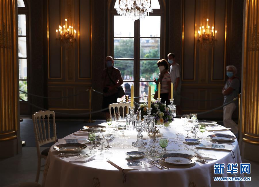 9月19日,在法国总统府爱丽舍宫的节日大厅,人们参观国宴餐桌和餐具。 为期两天的欧洲遗产日于19日拉开帷幕。受新冠肺炎疫情反弹影响,法国部分疫情严重地区宣布取消今年的遗产日活动。如期召开的遗产日活动中也对观众人数进行了严格限制,活动要求参观者提前在网上预约,参观过程中必须佩戴口罩,保持安全距离等。法国总统府爱丽舍宫今年将参观人数限制在每天2500人,为以往参观人数的三分之一。欧洲遗产日活动源于法国。最初这项活动定于每年9月的第三个周日举办,1992年改为周六和周日两天举行。如今,遗产日活动已经扩展到欧洲各国,成为整个欧洲的一项重要文化活动。 新华社记者 高静 摄