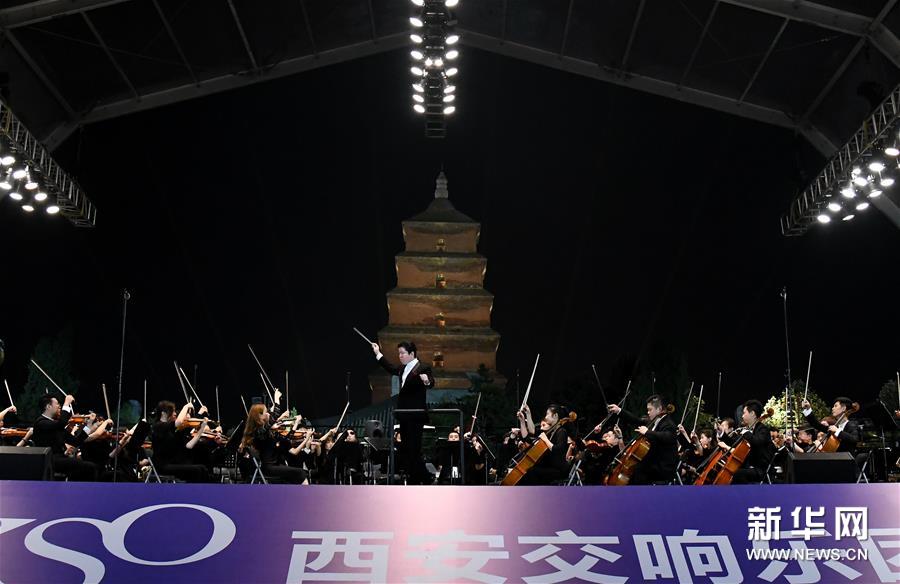 9月19日,西安交响乐团在西安市大雁塔北广场进行户外公演。新华社记者 李一博 摄