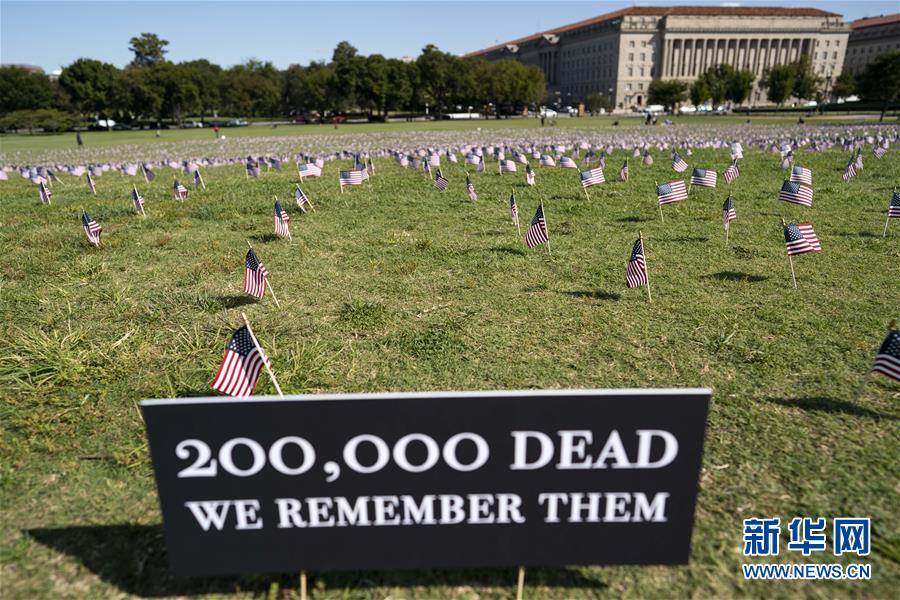 9月22日,在美国首都华盛顿,美国国旗摆放在草坪上悼念新冠逝者。 当日,2万面美国国旗摆放在华盛顿纪念碑附近悼念20万新冠逝者。美国约翰斯·霍普金斯大学22日发布的新冠疫情最新统计数据显示,截至美国东部时间22日11时23分(北京时间23时23分),美国累计新冠死亡病例超过20万例,达200005例,累计确诊病例6861211例。 新华社记者刘杰摄