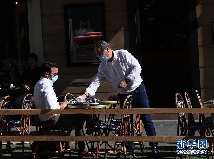 9月22日,在法国巴黎街头的一家咖啡馆,侍者与顾客均佩戴口罩。 法国政府网站22日公布的数据显示,该国过去24小时新增新冠确诊病例10008例,累计新冠确诊病例已逾46.8万例,疫情反弹加剧。 新华社记者 高静 摄