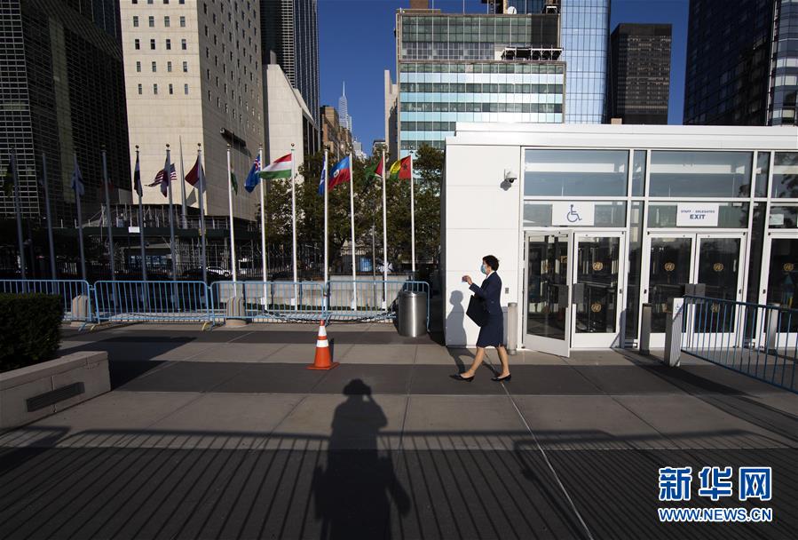 9月22日,一名与会代表进入位于纽约的联合国总部。 第75届联合国大会一般性辩论22日在纽约联合国总部拉开帷幕。受新冠疫情影响,联合国总部内参会者、工作人员、媒体记者等大幅减少。 新华社记者 王迎 摄