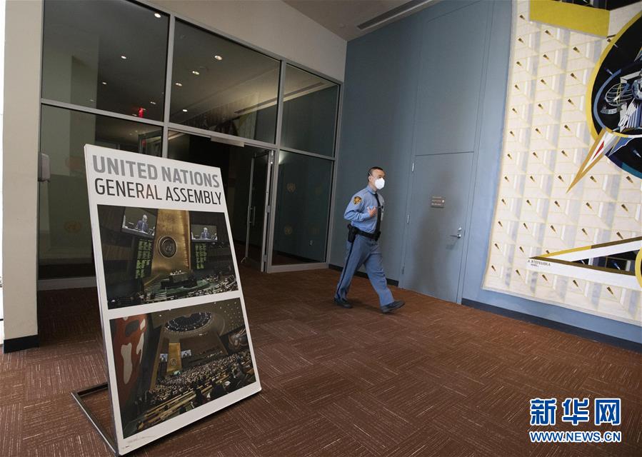 9月22日,在位于纽约的联合国总部,一名安保人员走过联大会议厅外的通道。 第75届联合国大会一般性辩论22日在纽约联合国总部拉开帷幕。受新冠疫情影响,联合国总部内参会者、工作人员、媒体记者等大幅减少。 新华社记者 王迎 摄