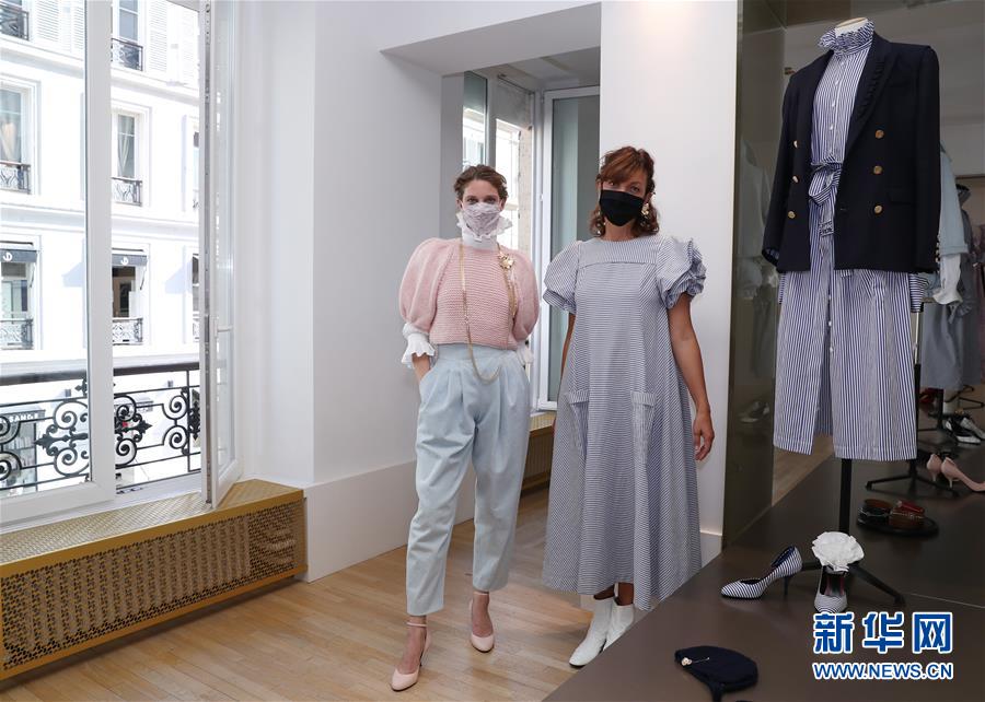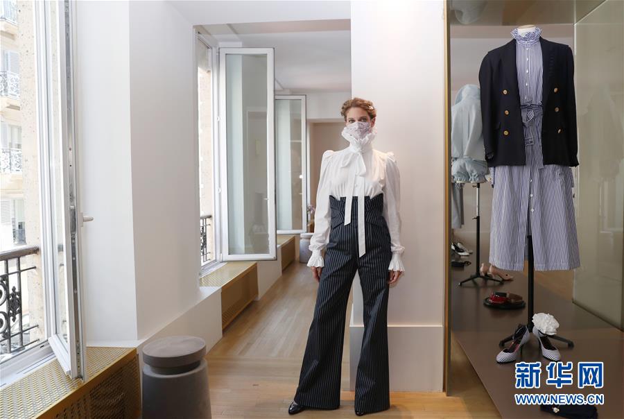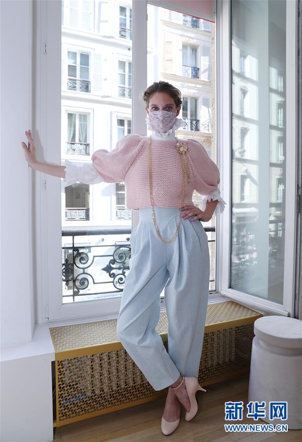 9月22日,法国设计师Prune Goldschmidt和模特在巴黎展示2021春夏新品。 在2021巴黎春夏时装周即将到来之际,9月22日,来自法国波尔多的年轻品牌Prune Goldschmidt在法国巴黎通过静态展示的方式推介其2021春夏新品。设计师Prune Goldschmidt在作品中融入了“口罩”元素。 新华社记者 高静 摄