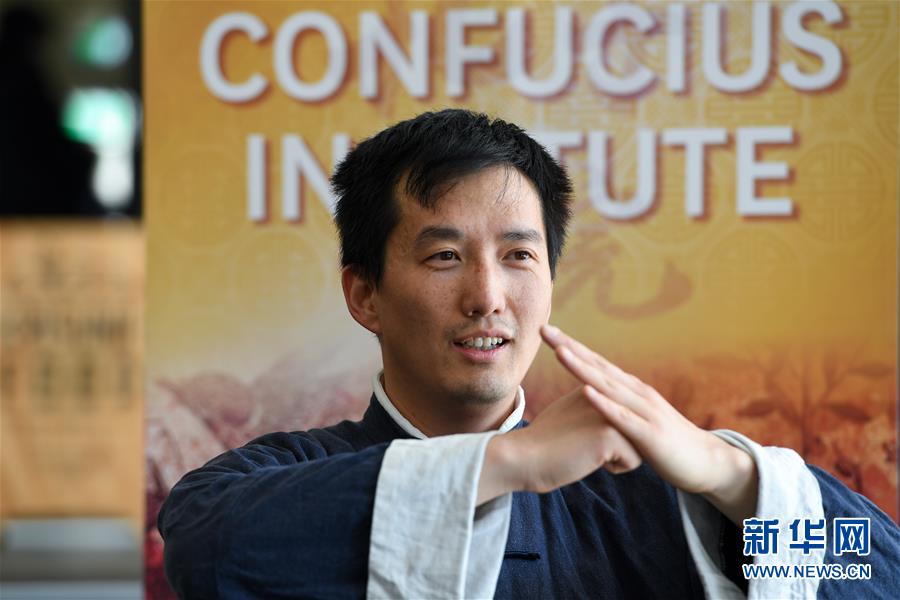 9月22日,孔子学院武术专职教师孟繁晓在新西兰惠灵顿维多利亚大学图书馆做武术展示。新华社记者 郭磊 摄