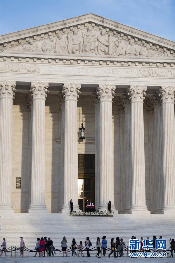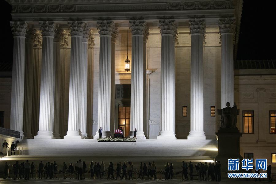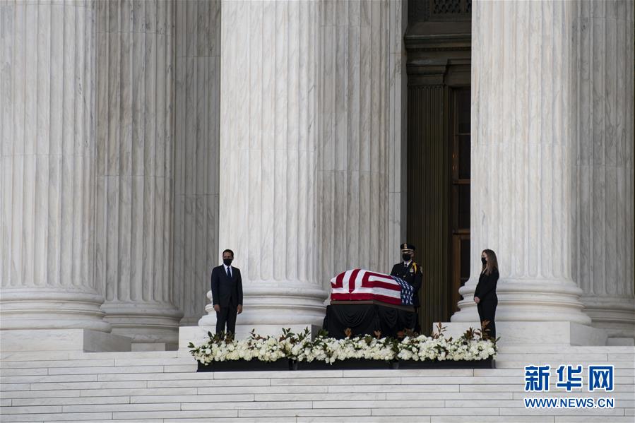 9月23日,在美国华盛顿,大法官金斯伯格的灵柩被安放在联邦最高法院的柱廊下。新华社记者 刘杰 摄