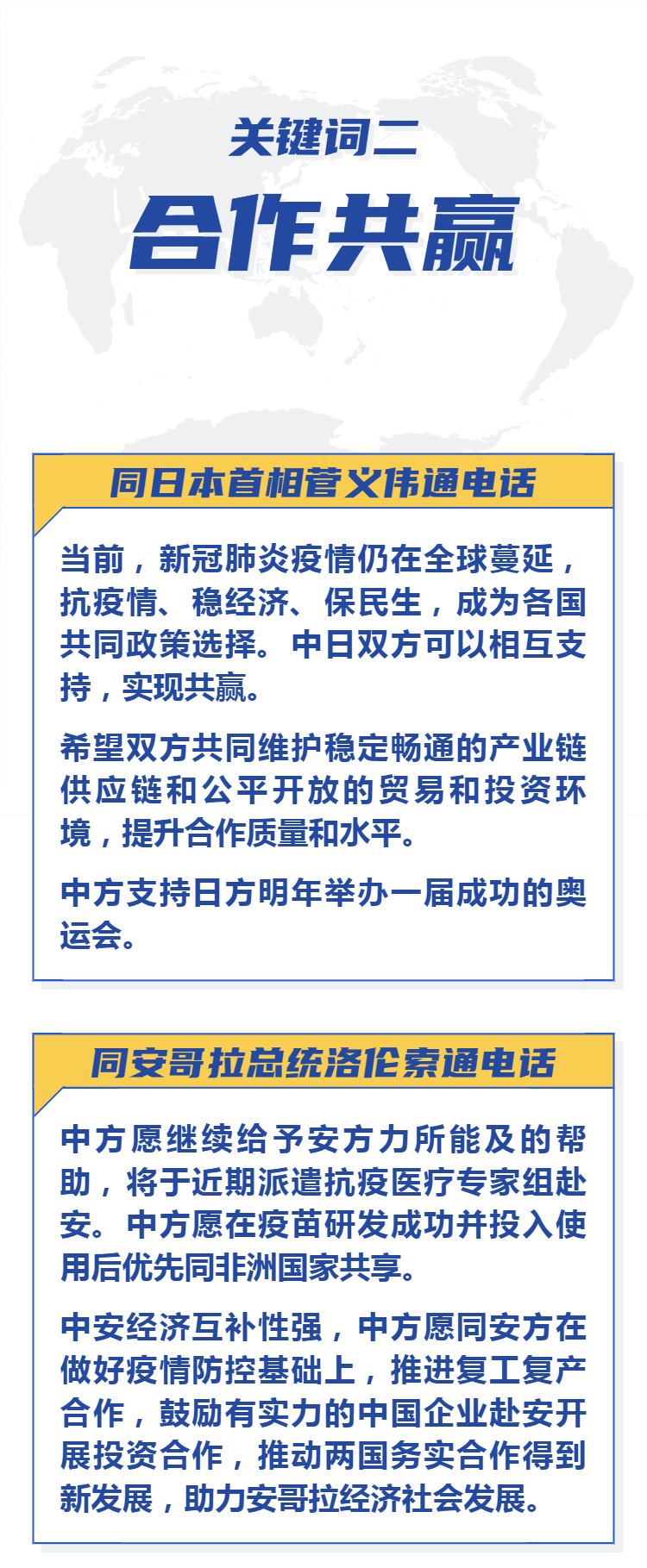 洛伦索预祝中国人民国庆节快乐。他表示,中国是唯一一个在短时间里成功控制新冠肺炎疫情的大国。安方感谢中方向包括安哥拉在内的非洲国家抗疫提供帮助,希望同中方加强疫苗等领域合作。安方高度重视同中国的高水平关系和深厚友谊,坚定支持中方在自身核心利益问题上的立场,欢迎中国企业加大对安哥拉的投资,拓展经贸等领域合作。安方愿同中方加强在国际事务中的相互支持,共同维护国际公平正义。(记者:陈杉、王雅晨;编辑:郝薇薇、金正、周啸天;制图:陈杉;新华社国际部 出品)