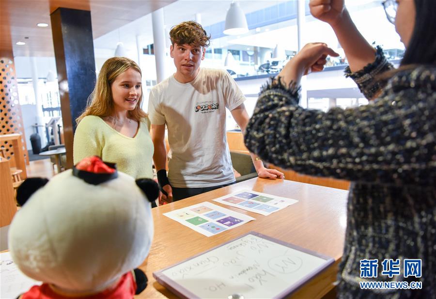 9月22日,在新西兰惠灵顿维多利亚大学图书馆,孔子学院中文教师鲁春晓(右)在汉语角向学生汉娜·科茨(左)和汤姆·斯科特教授基础中文口语。 新华社记者 郭磊 摄