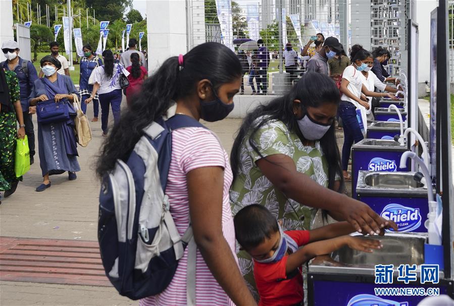 9月27日,几名读者在斯里兰卡科伦坡班达拉奈克国际会议大厦外洗手。 为期10天的斯里兰卡科伦坡国际图书展9月27日在科伦坡班达拉奈克国际会议大厦落下帷幕。按照卫生防疫要求,图书展在现场设置了多个临时洗手器,进入展厅需要测量体温并须佩戴口罩。 新华社记者 唐璐 摄