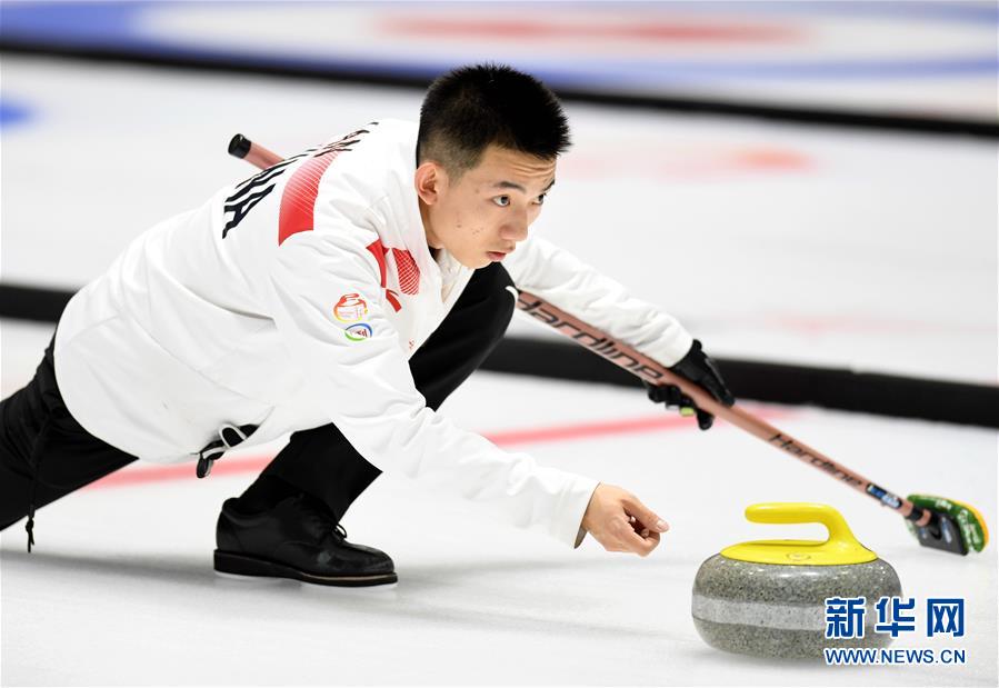 10月7日,扭转乾坤队选手韩鹏在混双比赛中。 当日,在北京首钢冰壶馆进行的冰壶国家集训队队内对抗赛第12轮比赛中,扭转乾坤队以27比18战胜一击即中队。 新华社记者 张晨霖 摄 |