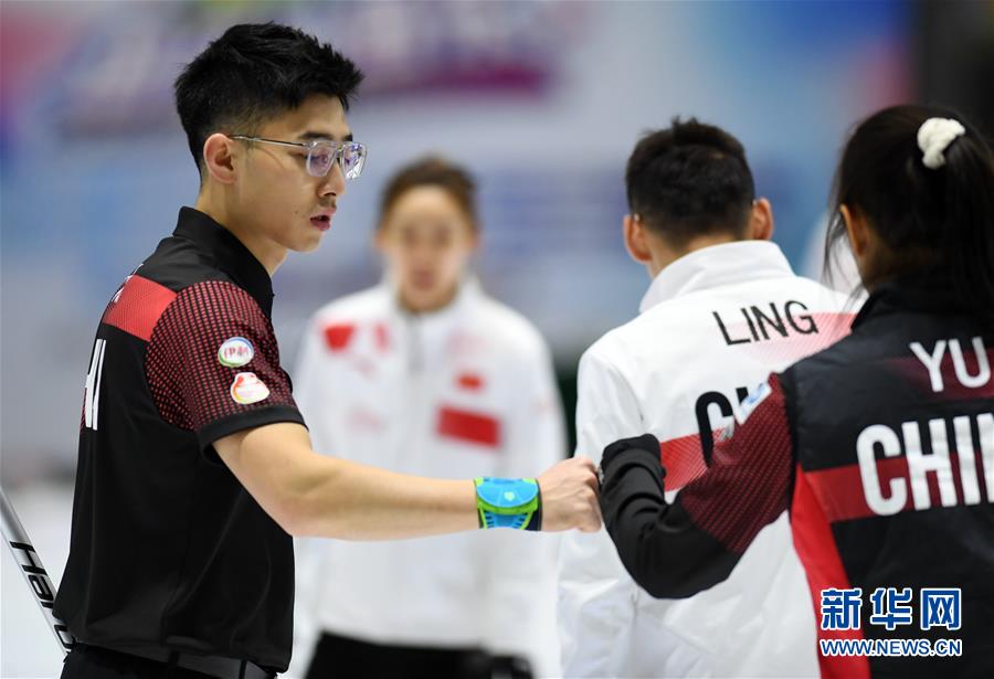 10月7日,一击即中队选手许静韬(左)与于佳新在混双比赛中相互鼓励。 当日,在北京首钢冰壶馆进行的冰壶国家集训队队内对抗赛第12轮比赛中,扭转乾坤队以27比18战胜一击即中队。 新华社记者 张晨霖 摄