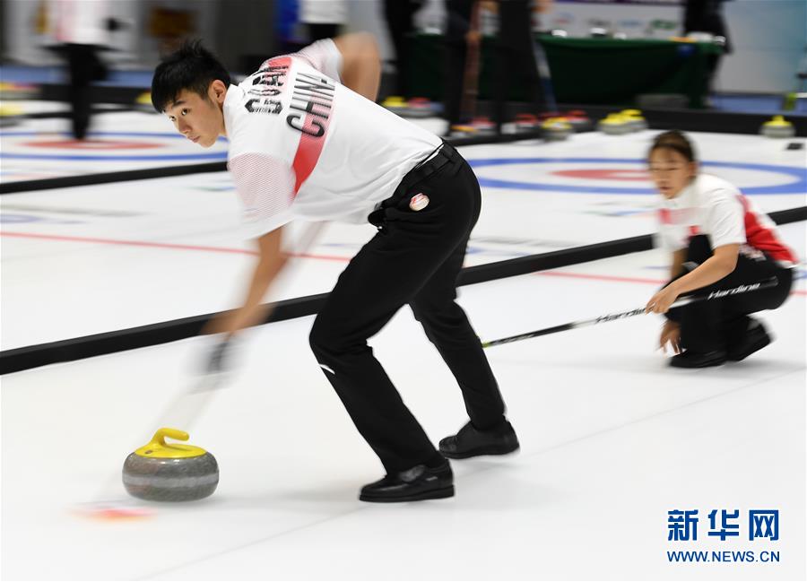 10月7日,一击即中队选手王智宇在混双比赛中。 当日,在北京首钢冰壶馆进行的冰壶国家集训队队内对抗赛第12轮比赛中,扭转乾坤队以27比18战胜一击即中队。 新华社记者 张晨霖 摄