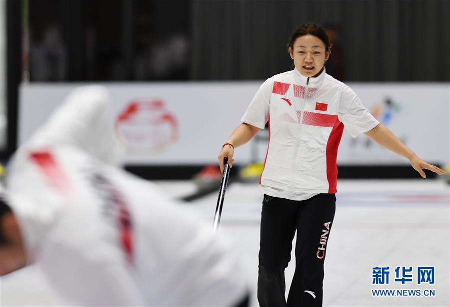 10月7日,扭转乾坤队选手韩雨在混双比赛中。 当日,在北京首钢冰壶馆进行的冰壶国家集训队队内对抗赛第12轮比赛中,扭转乾坤队以27比18战胜一击即中队。 新华社记者 张晨霖 摄