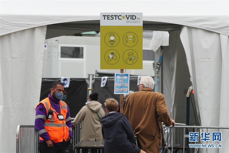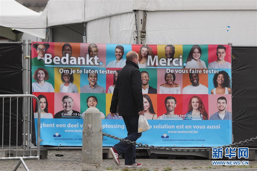 10月8日,民众经过比利时布鲁塞尔的一个新冠病毒检测点。新华社记者郑焕松摄