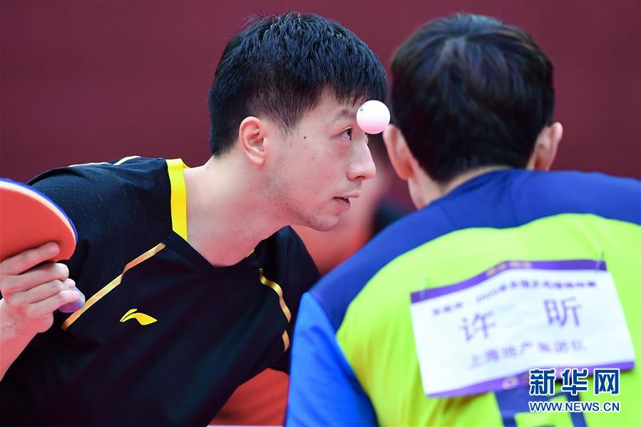 10月9日,马龙(左)/许昕在比赛中。 当日,在山东威海举行的2020全国乒乓球锦标赛男子双打决赛中,马龙(北京燕京啤酒)/许昕(上海地产集团)组合以4比1战胜广东队组合林高远/梁靖崑,获得冠军。 新华社记者朱峥摄