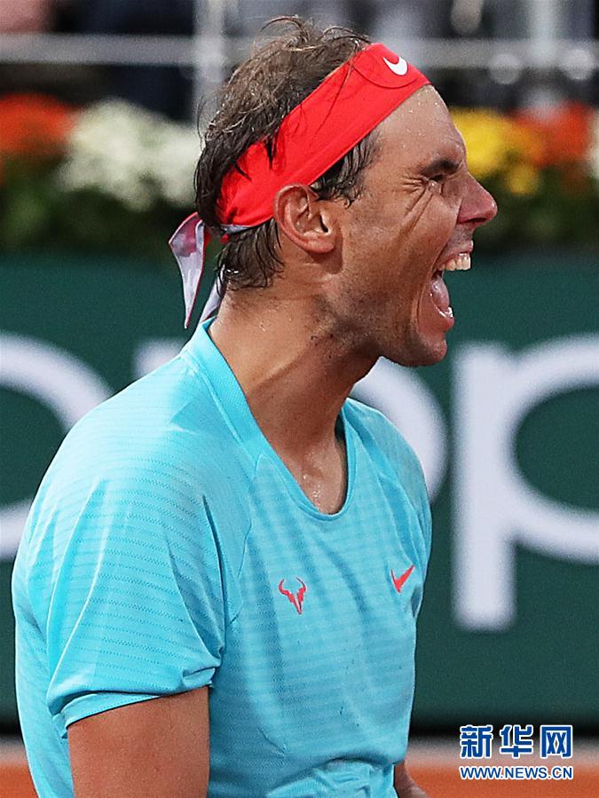 10月11日,纳达尔在比赛后庆祝夺冠。 当日,在法国巴黎进行的2020年法国网球公开赛男单决赛中,西班牙选手纳达尔以3比0战胜塞尔维亚选手焦科维奇,夺得冠军。 新华社记者 高静 摄