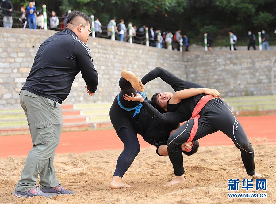 摔跤、跳板、秋千、武术、象帽舞……新学期伊始,延边大学体育和艺术学院的学生迎来了多种多样的特色体育体验课堂,众多学生参与到体育运动中来,强身健体。多年来,延边大学通过开设各类特色体育课程、兴趣班,丰富了学生们的学习生活。 这是延边大学体育学院学生刁志国(右)与王俊琦(中)在课堂上练习摔跤(9月22日摄)。 新华社记者 雒圆 摄