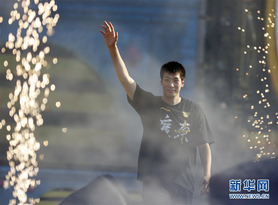 10月11日,广东宏远队球员任骏飞向球迷示意。 当日,2019-2020赛季CBA总冠军广东宏远队在广州长隆旅游度假区举行巡游活动。 新华社记者 黄国保 摄