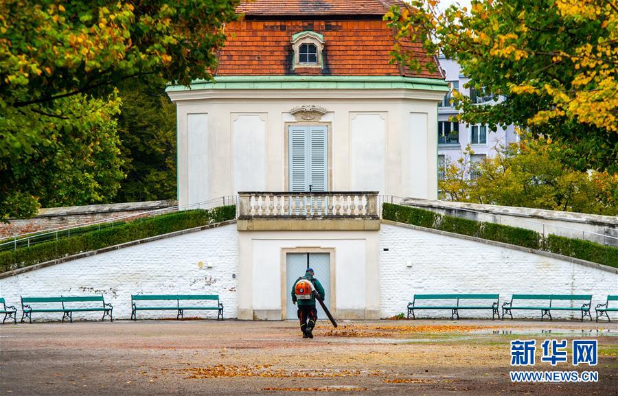 10月12日,一位工作人员在奥地利维也纳美景宫花园清扫落叶。 新华社记者 郭晨 摄