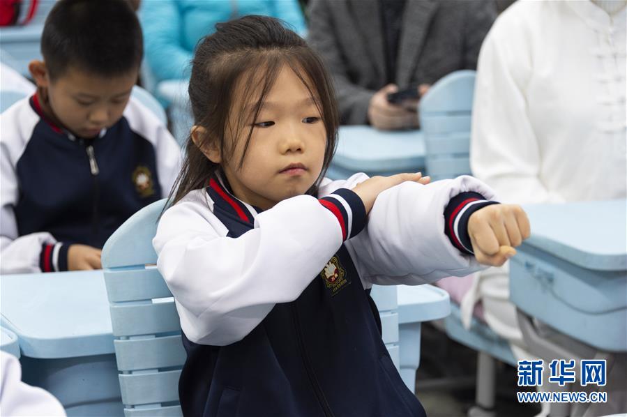 10月13日,在哈尔滨市延兴小学校,学生在课堂上学习启蒙益智拳。 从10月13日开始,黑龙江省传统武学研究会在哈尔滨市延兴小学校开展试点教学,把黑龙江省省级非物质文化遗产昆仑派无极门武功带进校园。延兴小学校二、三、四年级的学生们可以利用每周二大课间操时间学习非遗武术,在强健体魄的同时了解中国武术内涵,传承中国武术传统文化。 新华社记者 谢剑飞 摄