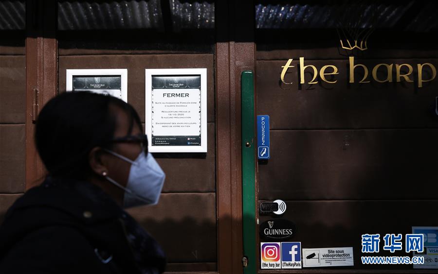10月14日,一名女子走过法国巴黎街头一家停业的酒吧。 法国总统马克龙14日晚宣布,将从17日起在法兰西岛大区(大巴黎地区)和其他8个大城市实施宵禁,以遏制新冠疫情。 新华社记者高静摄