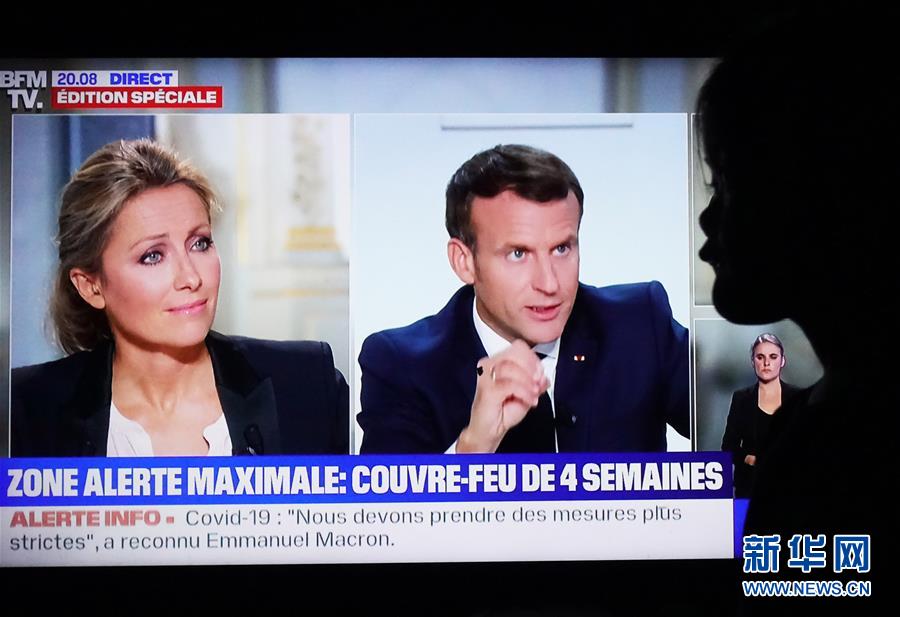 10月14日,观众在法国巴黎家中收看法国总统马克龙接受采访的电视节目。 法国总统马克龙14日晚宣布,将从17日起在法兰西岛大区(大巴黎地区)和其他8个大城市实施宵禁,以遏制新冠疫情。 新华社记者高静摄