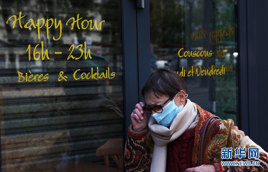 10月14日,一名路人经过法国巴黎一家停业的酒吧。 法国总统马克龙14日晚宣布,将从17日起在法兰西岛大区(大巴黎地区)和其他8个大城市实施宵禁,以遏制新冠疫情。 新华社记者高静摄