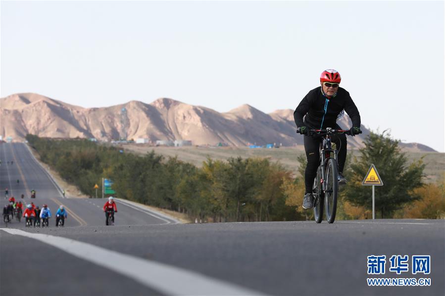 10月14日,参赛选手在比赛中骑行。 当日,环乌梁素海自行车赛在内蒙古乌梁素海举行,来自全区近200名参赛选手迎着朝阳骑行于环湖赛道,人与景交相辉映成为乌梁素海湖畔一道亮丽风景线。 新华社记者 李云平 摄