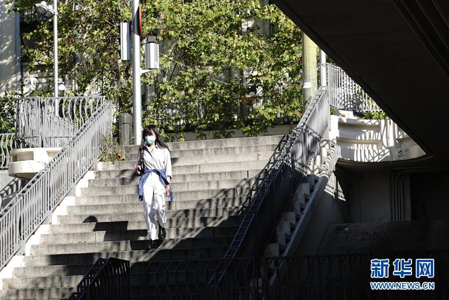10月14日,行人佩戴口罩走在西班牙马德里一处台阶上。 根据西班牙卫生部10月14日更新的数据显示,该国累计新冠确诊病例908056例。 新华社记者 孟鼎博 摄