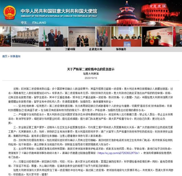 近期,欧洲第二波疫情来势凶猛,多个国家单日确诊人数连续攀升,其猛烈程度已超第一波疫情。意大利近来单日新增确诊人数屡创新高,过去一周患者死亡人数较前增加近40%。专家表示,第二波疫情尚未见顶,何时好转仍无定数。意大利政府已就此紧急出台严格的防控举措。目前,已有近百名旅意侨胞、留学生感染,其中不乏重症患者,受冲击之严重远超第一波疫情,教训深痛,令人警醒。为此,中国驻意大利使领馆再次郑重提醒全体旅意侨胞、留学生和中资机构人员,务请提高警惕,加强防范,确保健康和安全。