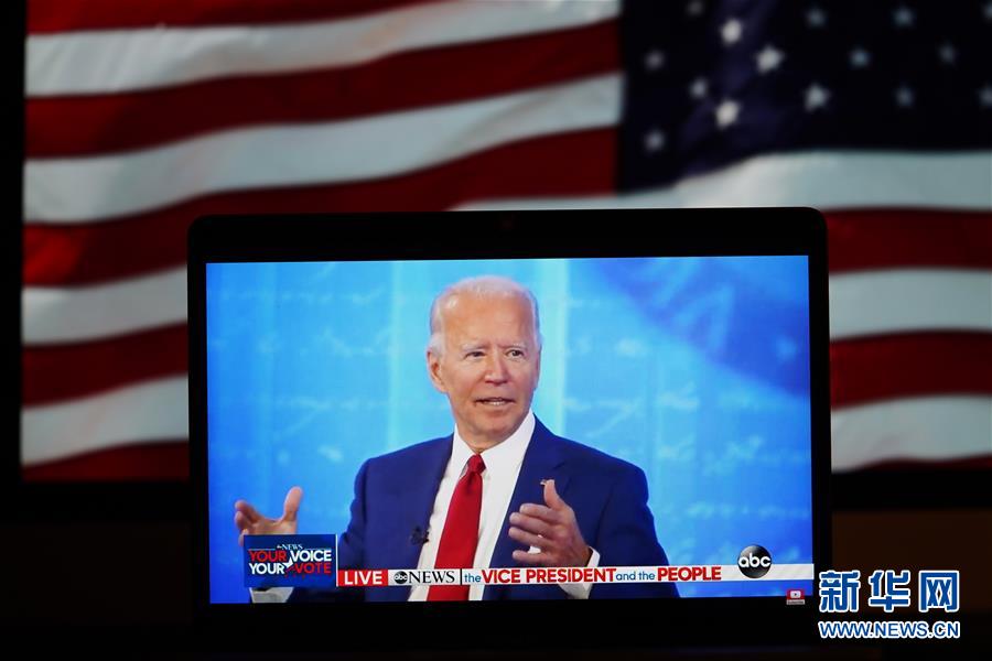 这张10月15日在美国弗吉尼亚州阿灵顿拍摄的照片显示,电视上正在播放民主党总统候选人、前美国副总统拜登(左)在宾夕法尼亚州费城参加选民问答会的节目。 美国现任总统、共和党总统候选人特朗普和民主党总统候选人、前美国副总统拜登15日晚分别在佛罗里达州迈阿密市和宾夕法尼亚州费城参加选民问答会。 新华社记者 刘杰 摄