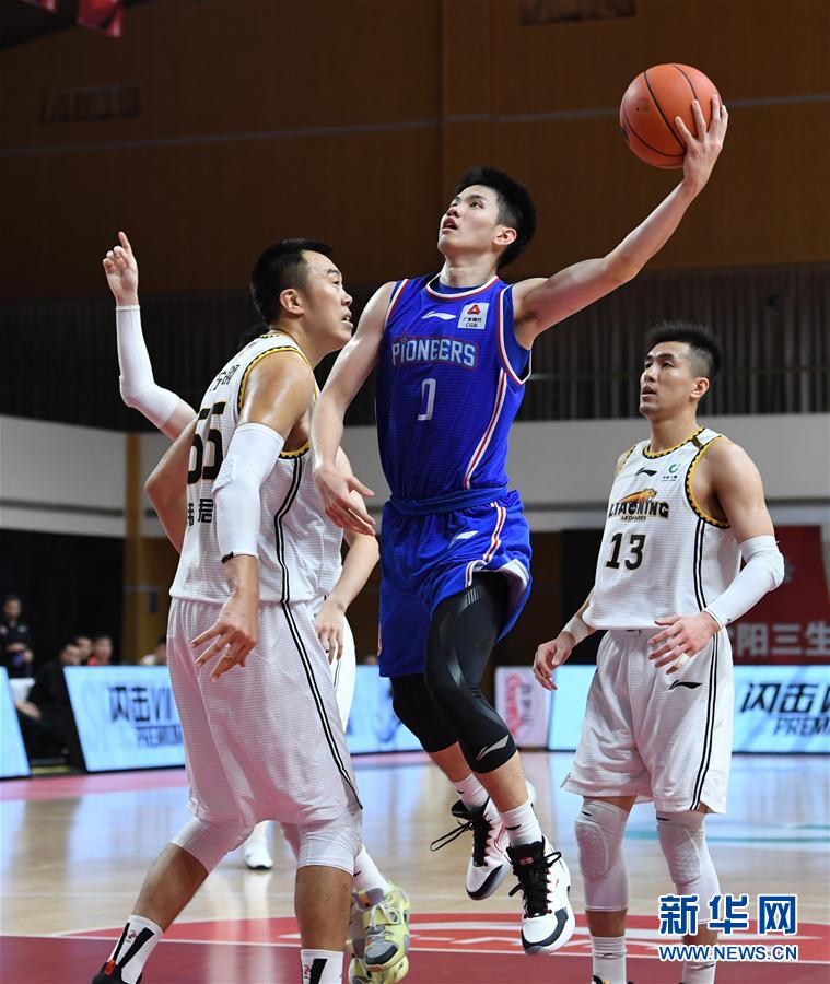10月19日,天津先行者队球员林庭谦(右二)在比赛中上篮。 当日,在浙江诸暨举行的2020-2021中国男子篮球职业联赛(CBA)第一阶段比赛首轮比赛中,辽宁本钢队以121比108战胜天津先行者队。 新华社记者 沙达提 摄