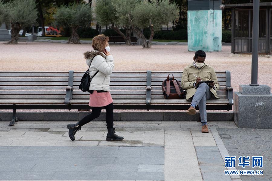 这是10月21日在西班牙马德里哥伦布广场上拍摄的佩戴口罩的人们。新华社记者 孟鼎博 摄 |