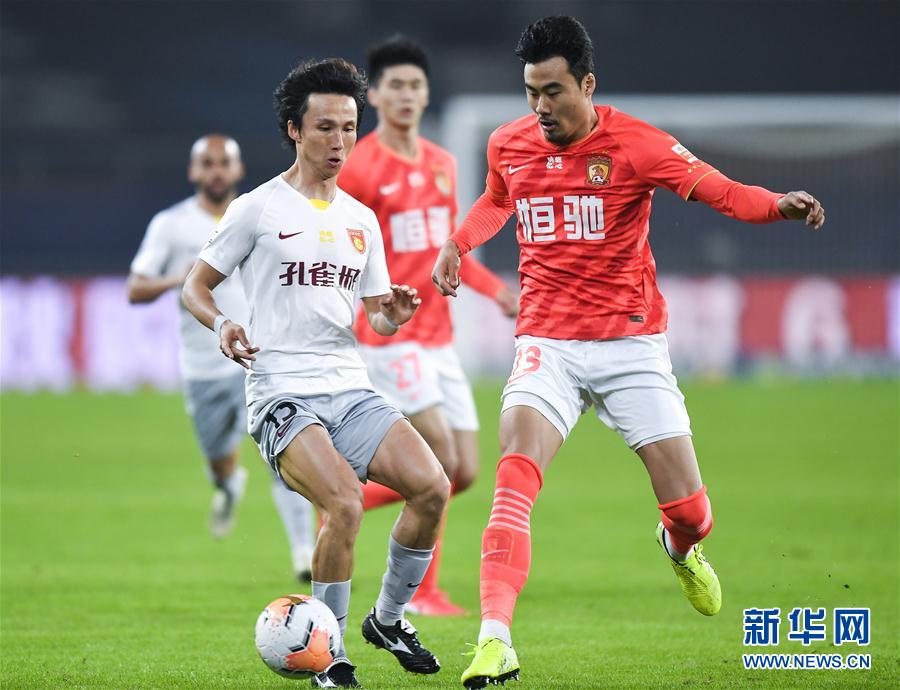 10月21日,广州恒大淘宝队球员朴志洙(右)与河北华夏幸福队球员尹鸿博拼抢。 当日,在2020赛季中国足球协会超级联赛(苏州赛区)第16轮比赛中,广州恒大淘宝队以5比0战胜河北华夏幸福队。最终广州恒大淘宝队以两轮总比分8比1战胜河北华夏幸福队,晋级四强。 新华社记者 许畅 摄