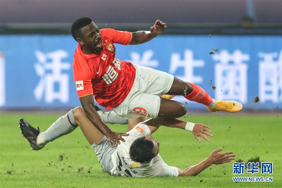 10月21日,广州恒大淘宝队球员费南多(上)与河北华夏幸福队球员潘喜明在比赛中拼抢。 当日,在2020赛季中国足球协会超级联赛(苏州赛区)第16轮比赛中,广州恒大淘宝队以5比0战胜河北华夏幸福队。最终广州恒大淘宝队以两轮总比分8比1战胜河北华夏幸福队,晋级四强。 新华社记者杨磊摄