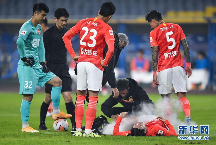 10月21日,广州恒大淘宝队球员张修维(下)接受队医治疗。 当日,在2020赛季中国足球协会超级联赛(苏州赛区)第16轮比赛中,广州恒大淘宝队以5比0战胜河北华夏幸福队。最终广州恒大淘宝队以两轮总比分8比1战胜河北华夏幸福队,晋级四强。 新华社记者 许畅 摄