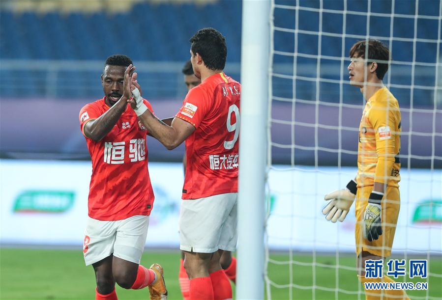 10月21日,广州恒大淘宝队球员塔利斯卡(前)在比赛中与队友保利尼奥庆祝进球。 当日,在2020赛季中国足球协会超级联赛(苏州赛区)第16轮比赛中,广州恒大淘宝队以5比0战胜河北华夏幸福队。最终广州恒大淘宝队以两轮总比分8比1战胜河北华夏幸福队,晋级四强。 新华社记者许畅摄