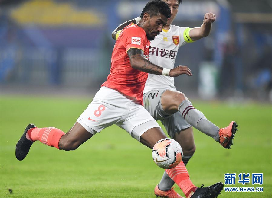 10月21日,广州恒大淘宝队球员保利尼奥(左)在比赛中射门。当日,在2020赛季中国足球协会超级联赛(苏州赛区)第16轮比赛中,广州恒大淘宝队以5比0战胜河北华夏幸福队。最终广州恒大淘宝队以两轮总比分8比1战胜河北华夏幸福队,晋级四强。 新华社记者许畅摄 |