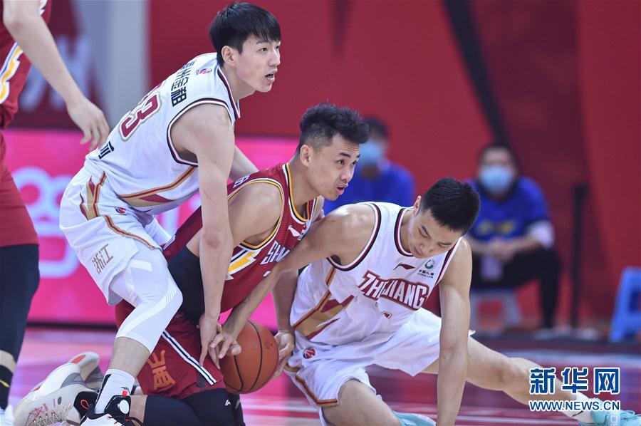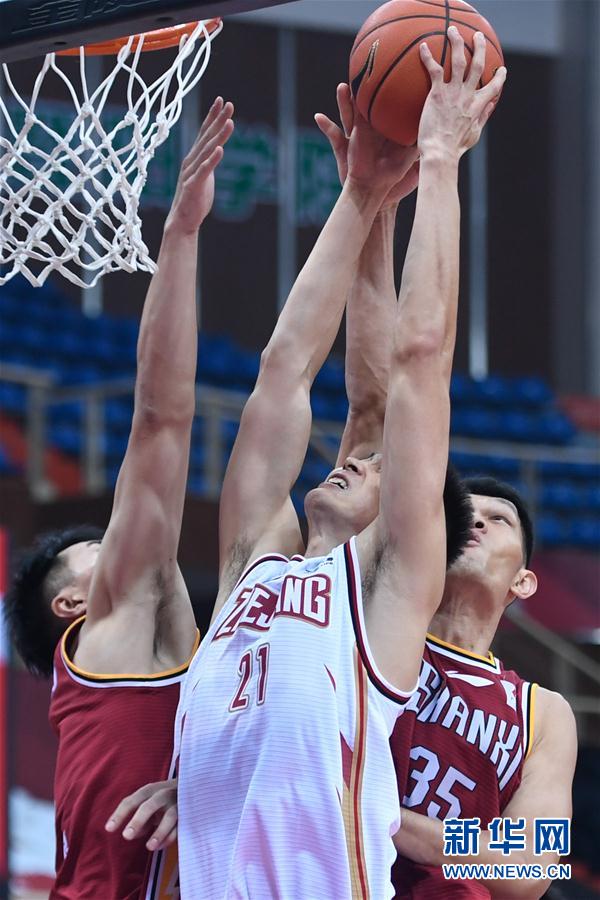 10月22日,浙江稠州金租队球员朱旭航(中)在比赛中上篮。 当日,在浙江诸暨举行的2020-2021赛季中国男子篮球职业联赛(CBA)第一阶段第三轮比赛中,浙江稠州金租队以105比93战胜山西汾酒股份队。 新华社记者黄宗治摄