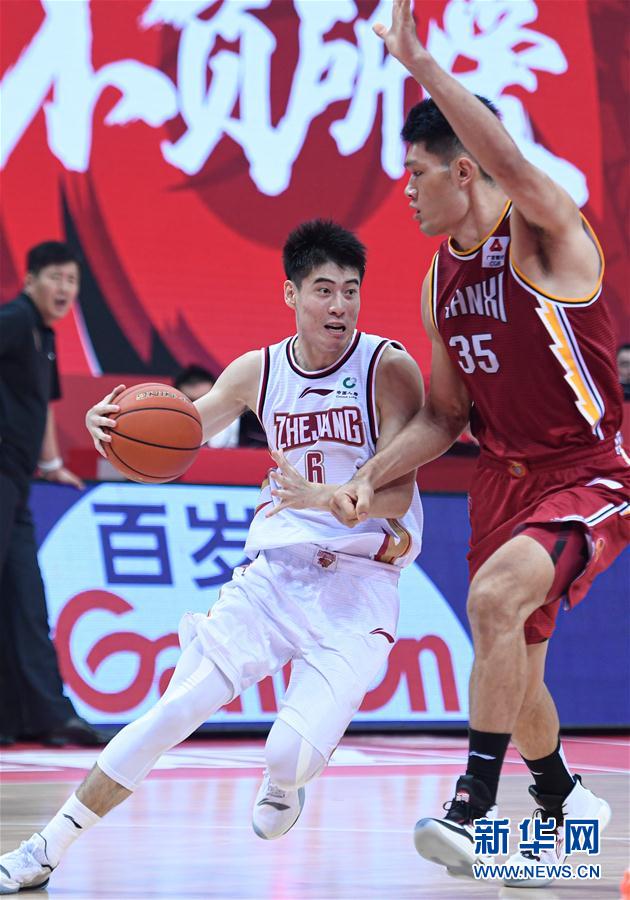 10月22日,浙江稠州金租队球员程帅澎(左)在比赛中带球进攻。 当日,在浙江诸暨举行的2020-2021赛季中国男子篮球职业联赛(CBA)第一阶段第三轮比赛中,浙江稠州金租队以105比93战胜山西汾酒股份队。 新华社记者黄宗治摄